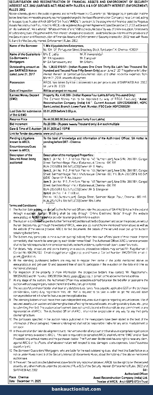 Description of the mortgaged Properties: Item 1: Unit No. 'F-1', First floor, Plot no. 143 [Northern part), New S.No. 286/181, Gangai Street, Santhosh Nagar, Porur, Maduravoyal, Chennai-600 116 BUA-283.5Sft & 195.5sft [UDS] Owner: Mr. S. Ramu Item 2: Unit No. 'F-2, First floor, Plot no. 143 [Northern part), New S.No. 265/181, Gangai Street, Santhosh Nagar, Porur, Maduravoyal, Chennai-600 116, BUA-283.55ft & 195.5st [UDS] Owner: Mr. R. Kirubakaran. Item 3: Unit No. 'F-3', First floor, Plot no. 143 [Northern part), New S.No. 266/181, Gangai Street, Santhosh Nagar, Porur, Maduravoyal, Chennai-600 116 BUA-283.55ft & 195.5st [UDS] Owner: Mr. S. Elangovan Item 4: Unit No. F-4, First floor, BUA- 2835Sft & 195.5st [UDS] Owner: Mrs. Latha Plot no. 143 (Northem part), Gangai Street, Santhosh Nagar, Porur, Chennai
