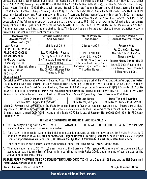 Description Of The Immovable Property/ Secured Asset: All that piece and parcel of the Virugambakkam Village, Mambalam -Guindy Taluk, Chennai District Undivided share in land