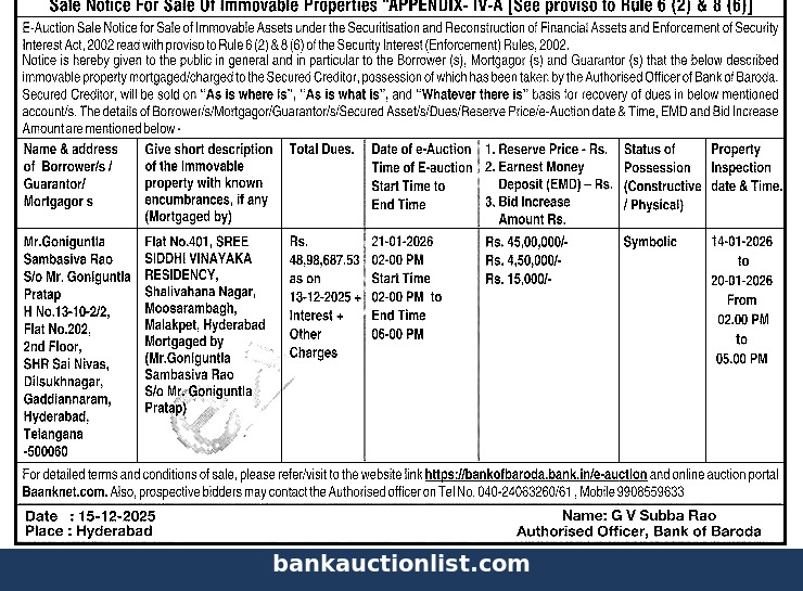 Flat No.401, SREE SIDDHI VINAYAKA RESIDENCY, Shalivahana Nagar, Moosarambagh, Malakpet, Hyderabad Mortgaged by (Mr.Goniguntla Sambasiva Rao S/o Mr. Goniguntla Pratap)