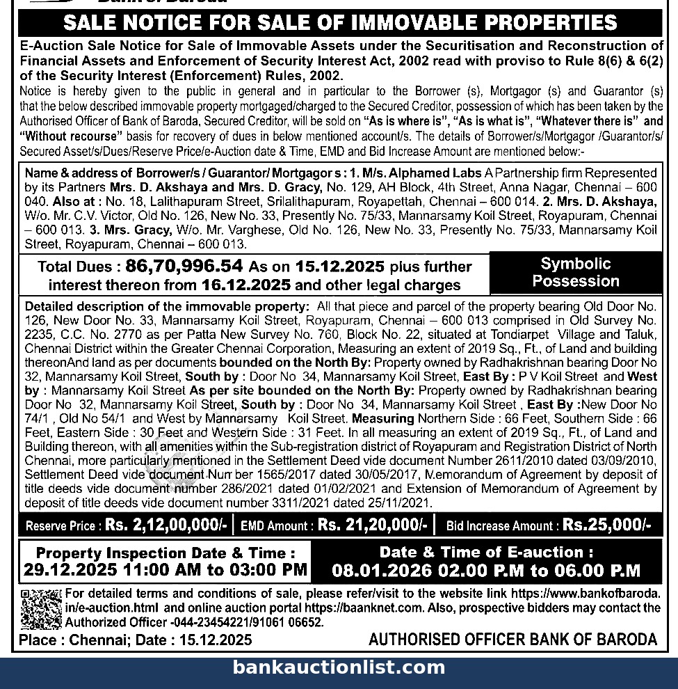 Detailed description of the immovable property: All that piece and parcel of the property bearing Old Door No. 126, New Door No. 33, Mannarsamy Koil Street, Royapuram, Chennai 600 013