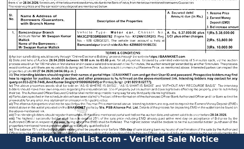 Vehicle Type Motor car, Chassis No MA3CZFB3SRB866782, Engine No.- K12NN1058283, Reg. No. WB 42BG6321. The vehicle loan account is held at Bamcandaipur branch vide A/c No-429860510000335.