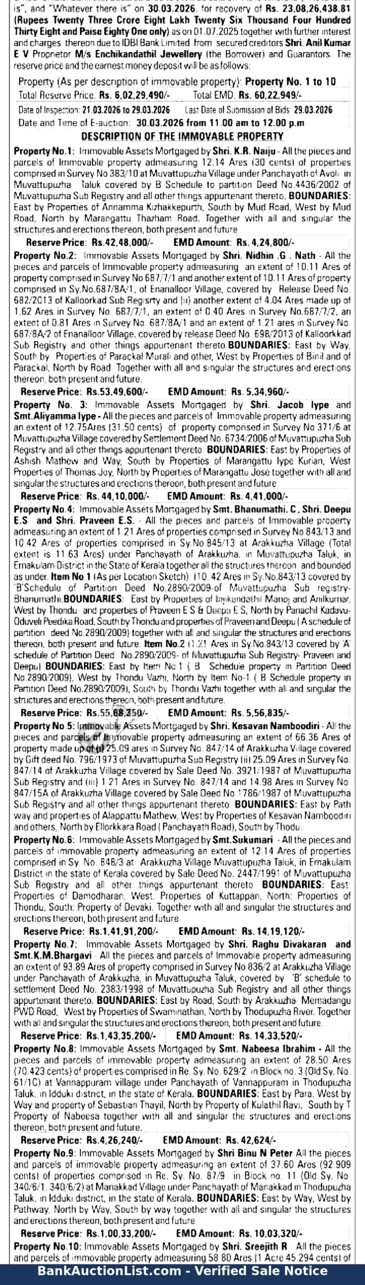 Property No.10: Immovable Assets Mortgaged by Shri. Sreejith R All the pieces and parcels of immovable property ad