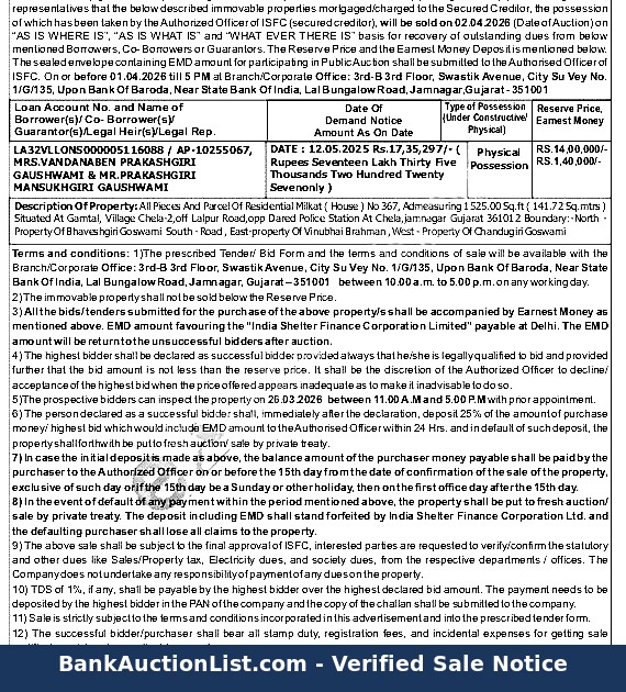 Situated At Gamtal, Village Chela-2, off Lalpur Road, opp Dared Police Station At Chela, jamnagar Gujarat 361012 Boundary:-North-Property Of Bhaveshgiri Goswami South-Road, East-property Of Vinubhai Brahman, West-Property Of Chandugiri Goswami