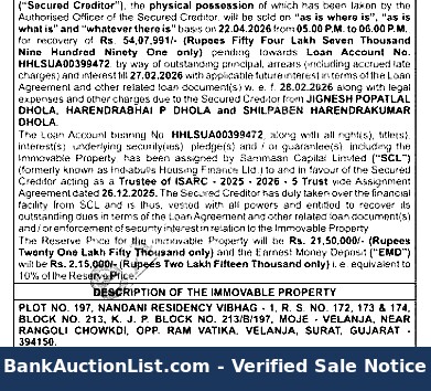 PLOT NO. 197, NANDANI RESIDENCY VIBHAG1, R. S. NO. 172, 173 & 174, BLOCK NO. 213, K. J. P. BLOCK NO. 213/B/197, MOJE VELANJA, NEAR RANGOLI CHOWKDI, OPP. RAM VATIKA, VELANJA, SURAT, GUJARAT 394150.