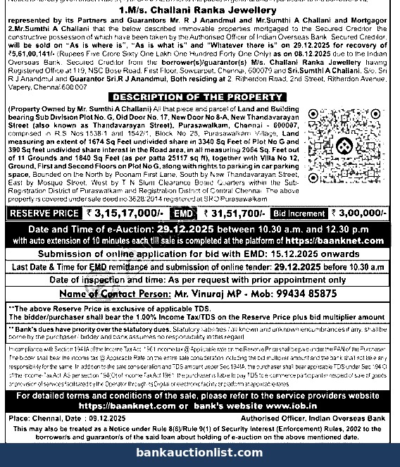 (Property Owned by Mr. Sumthi A Challani) All that piece and parcel of Land and Building bearing Sub Division Plot No. G. Old Door No. 17, New Door No 8-A, New Thandavarayan Street (also known as Thandavarayan Street), Purasawalkam, Chennai 600007, comprised in R.S Nos. 1538/1 and 1542/1, Block No 25, Purasawalkam Village, Land measuring an extent of 1674 Sq Feet undivided share in 3340 Sq Feet of Plot No G and 390 Sq feet undivided share interest in the Road area, in all measuring 2064 Sq. Feet out of 11 Grounds and 1840 Sq Feet (as per patta 25117 sq ft), together with Villa No 12, Ground, First and Second Floors on Plot No G, along with rights to parking in car parking space, Bounded on the North by Poonam First Lane, South by New Thandavarayan Street. East by Mosque Street, West by T N Slum Clearance Board Quarters within the Sub-Registration District of Puraswalkam and Registration District of Central Chennai. The above property is covered under sale deed no 3628/2014 registered at SRO Purasawalkam