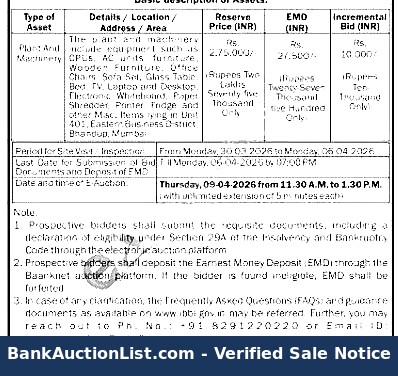 The plant and machinery include equipment such as furniture, CPUs, AC units, furniture. Wooden Furniture, Office Chairs, Sofa Set, Glass Table, Bed, TV, Laptop and Desktop, Electronic Whiteboard. Paper Shredder, Printer, Fridge and other Misc. Items Items lying in Unit 405, Eastern Business District, Bhandup, Mumbai