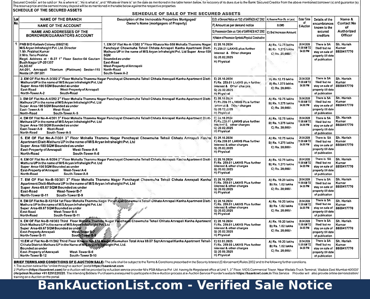 4. EM OF Fiat No-A-4/301 3" Floor Mohalla Thammu Nagar Panchayat Chowmuha Tehsil Chhata Amrapali Kanha Apartment Distt-Mathura UP in the name of M/S Aryan Infraheight Pvt. Ltd Super Area-100 SQM Bounded as under East-Tower A-9 West-Road North-Road South-Tower A-5