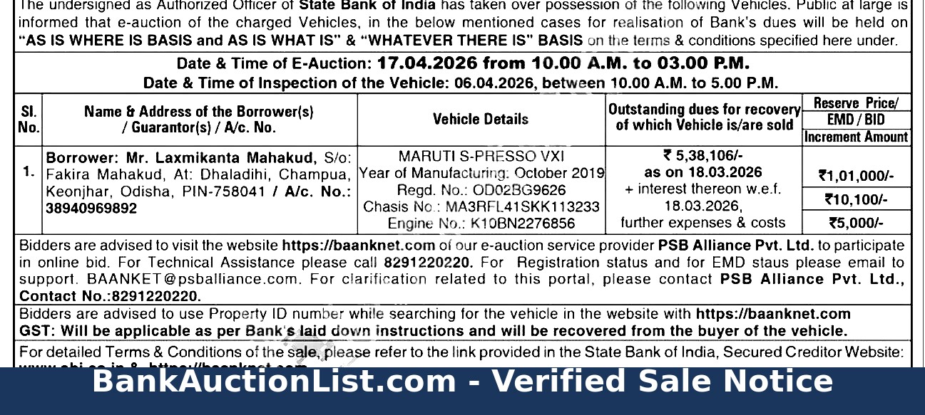 MARUTI S-PRESSO VXI Year of Manufacturing: October 2019 Regd. No.: OD02BG9626 Chasis No.: MA3RFL41SKK113233 Engine No.: K10BN2276856