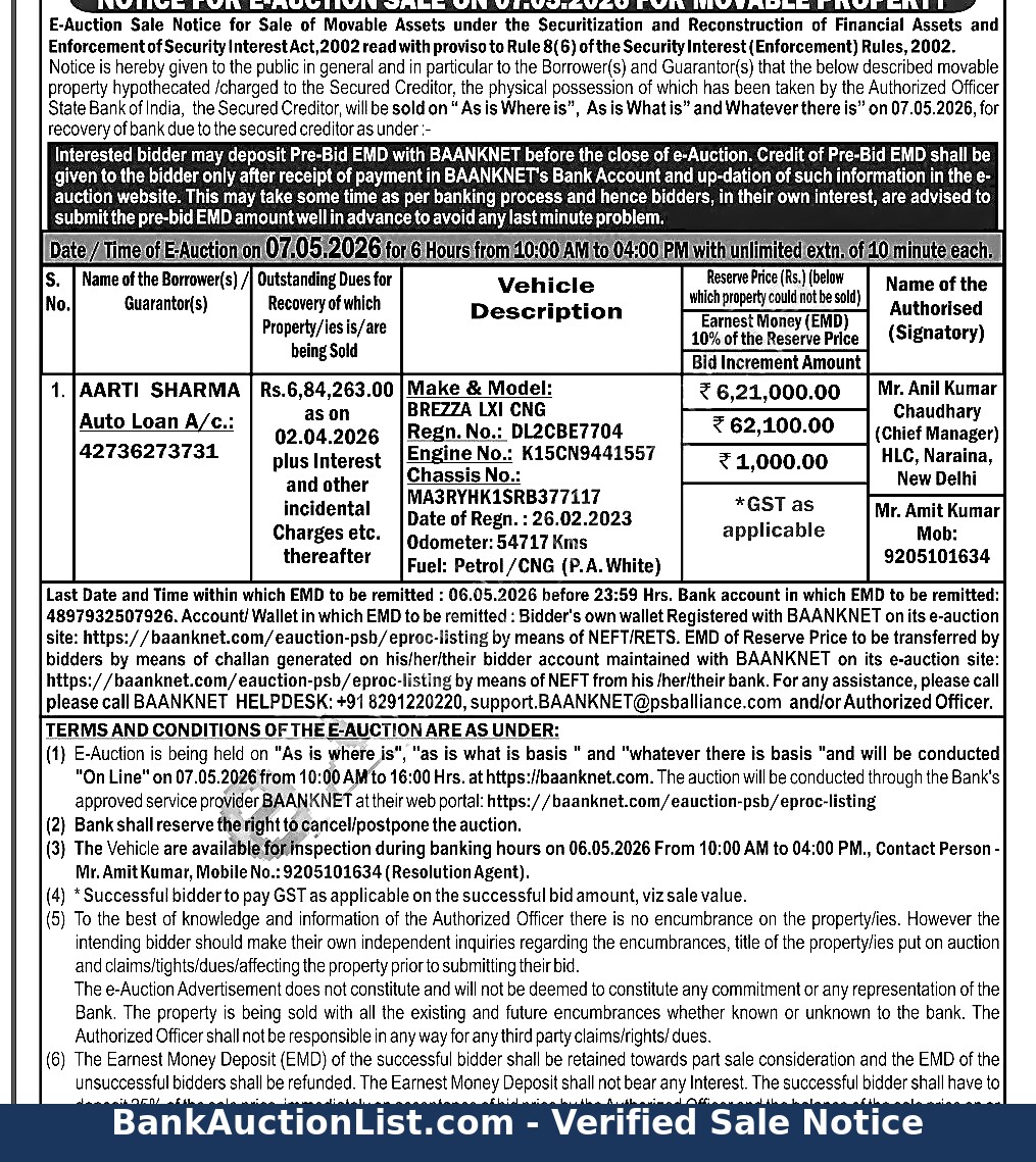 Make & Model: BREZZA LXI CNG Regn. No.: DL2CBE7704 Engine No.: K15CN9441557 Chassis No.: MA3RYHK1SRB377117 Date of Regn.: 26.02.2023 Odometer: 54717 Kms Fuel: Petrol/CNG (P.A. White)