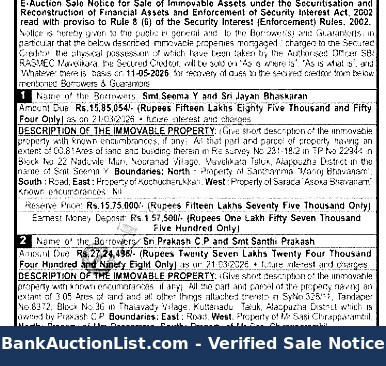 DESCRIPTION OF THE IMMOVABLE PROPERTY: (Give short description of the immovable property with known encumbrances, if any) All that part and parcel of of property having an extent of 00.81 Ares of land and building therein in Re survey No 231/18/2 in TP No 22944 in Block No 22 Naduvile Muri, Nooranad Village. Mavelikara Taluk, Alappuzha District in the name of Smit Seema Y. Boundaries: North Property of Santhamma Manoj Bhavanam