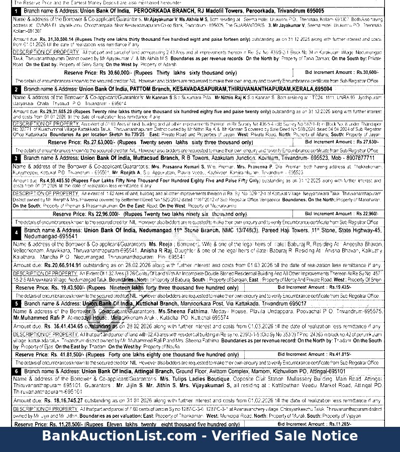 3) An extent of 1.62 Ares of land, building and all other improvements thereon in Re. Sy. No. 329/12-1 of Kottukal Village, Neyyatinkara Taluk, Thiruvananthapuram District owned by Mr. Renjith& Mrs. Praveena covered by Settlement Deed No. 1523/2012 dated 11/07/2012 of Sub Registrar Office Venganoor, Boundaries: On the