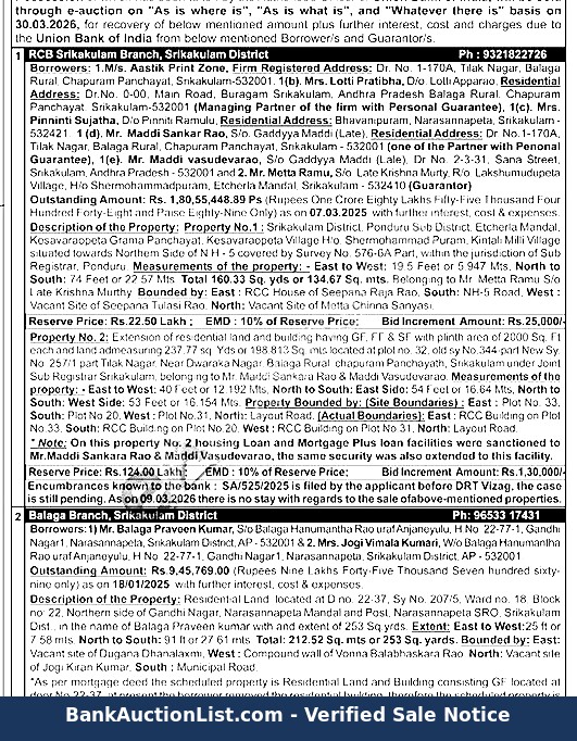 Description of the Property: Property No.1: Srikakulam District, Ponduru Sub District, Etcherla Mandal, Kesavaraopeta Grama Panchayat, Kesavaraopeta Village H/o. Shermohammad Puram, Kintali Milli Village situated towards Northem Side of N.H-5 covered by Survey No. 576-6A Part, within the jurisdiction of Sub Registrar, Ponduru. Measurements of the property: East to